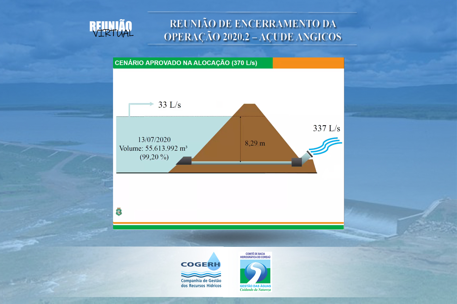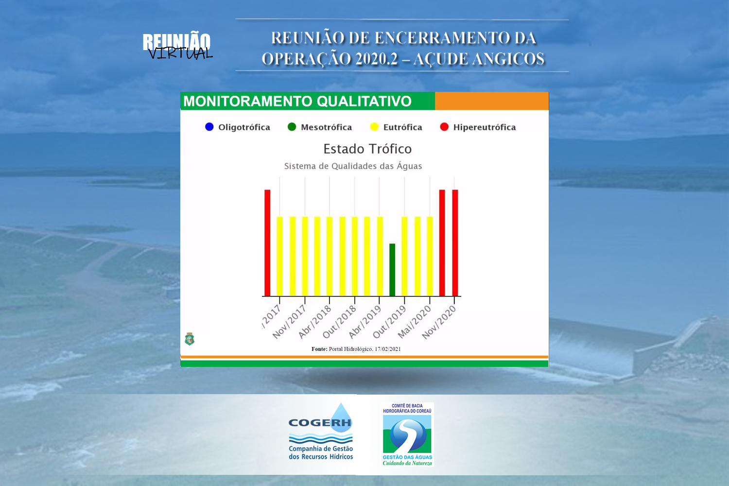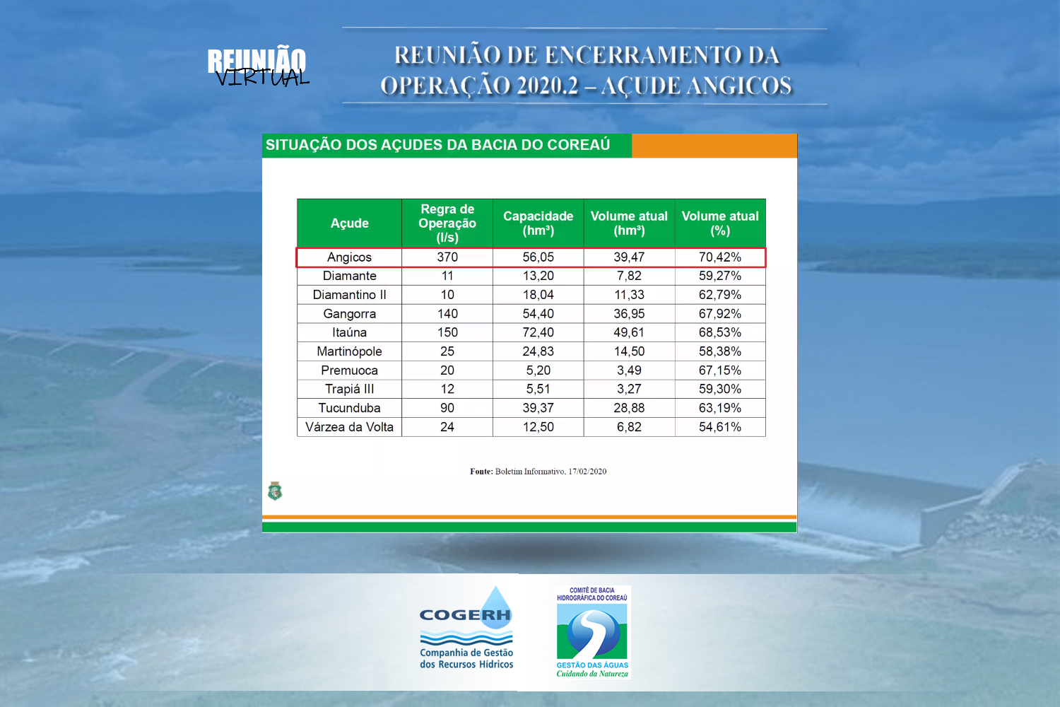 No dia 19 de fevereiro de 2021 aconteceu, em formato virtual, reunião e acompanhamento do Açude Angicos. O encontro teve por objetivo avaliar a operação do Açude Angicos durante o segundo semestre do ano de 2020.2, que encerrou-se em 31 de janeiro de 2021. E contou com a presença dos técnicos da  COGERH Sobral Kamylle Prado, Assis Sousa e Eduardo Rodrigues. Dos municípios e usuários estiveram presentes Maria Zuleide Fujiwaha – Secretária de Assistência Social do Município, Sr. Francivaldo Silva e Sr. José Nascimento – STR de Frecheirinha, Sr. Milton e Eraldo Lima -Prefeitura de Uruoca, Sr. Ornílio – STR de Coreaú, Sr. Laércio – Uruoca, Magum – EMATERCE de Moraújo.