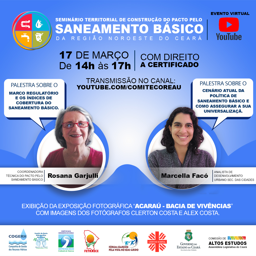 No dia 17 de março de 2021, às 14h acontece o SEMINÁRIO TERRITORIAL DE CONSTRUÇÃO DO PACTO PELO SANEAMENTO BÁSICO DA REGIÃO NOROESTE DO CEARÁ. O evento ocorrerá de forma virtual pelo YouTube com direito a certificado de participação. No momento teremos a exibição da exposição fotográfica ACARAÚ, BACIA DE VIVÊNCIAS com fotografias do Rio Acaraú feitas pelos fotógrafos Clerton Costa e Alex Costa.